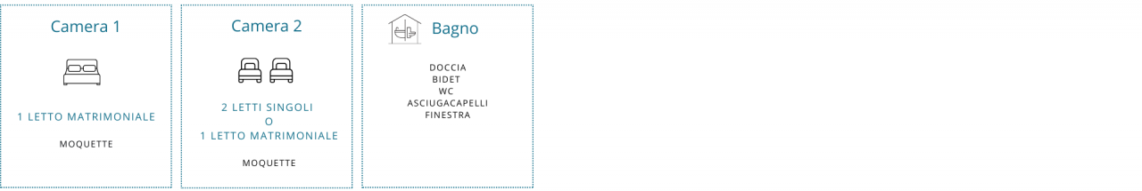 2 camere da letto entrambe dotate di moquette, la prima con letto matrimoniale (non separabile) e la seconda con 2 letti singoli, avvicinabili in base alle esigenze dei nostri ospiti.