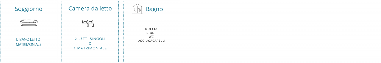 I bilocali sono dotati di zono giorno con angolo cottura, tavolo da pranzo, divano letto e tv; camera con 2 letti singoli (avvicinabili a matrimoniale su richiesta) e bagno con doccia, bidet, wc e asciugacapelli.