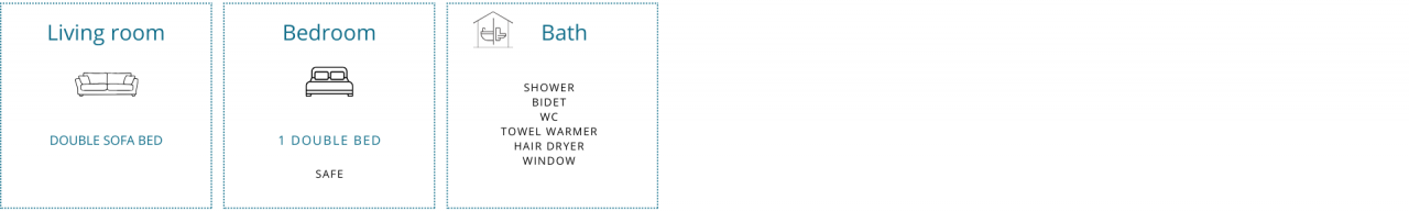 Equipped with underfloor heating and wooden floors, the holiday apartment consists of a spacious living room with fully equipped kitchen, comfortable double sofa bed and TV, a bedroom with double bed, large wardrobes and safe. The bathroom offers a large shower cubicle, bidet, toilet, hairdryer and towel warmer.