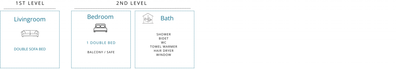 With underfloor heating and wooden parquet, the first floor includes a roomy living room with a modern fully-equipped kitchen, a comfortable double sofa bed, and TV set; while the second floor features a double bedroom, balcony, large closets and a safety box. The bathroom features a big shower, bidet, toilet, hair-drier and towel warmer. The two floors are connected by a large, classy wooden staircase.