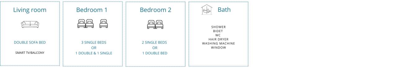 The apartment is perfect for accommodating 6 guests. An extra bed gives the option to add a seventh person, and is an ideal solution for large families or a group of friends.