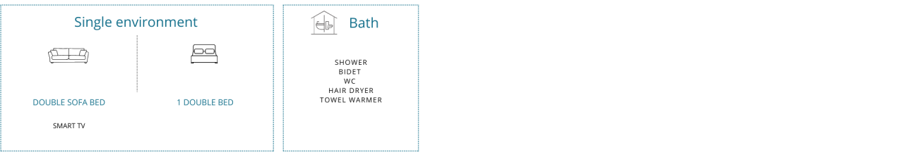 The studio apartment, a pleasant and very well organized environment, is equipped with wooden floors and underfloor heating. The living area with kitchenette, dining table, double sofa bed and TV is separated by a half-height partition wall designed to guarantee privacy from the sleeping area, which houses the double bed and a functional wardrobe. The bathroom consists of a large shower cubicle and shower head, bidet, toilet, hairdryer and heated towel rail.